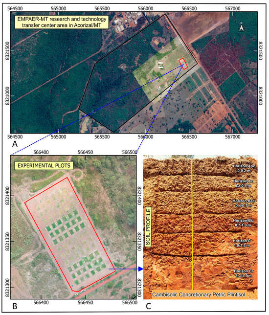 Research Station of the Empresa Mato-Grossense de Pesquisa, Assistência e Extensão Rural. (A) Area, (B) plots, and (C) soil profile.