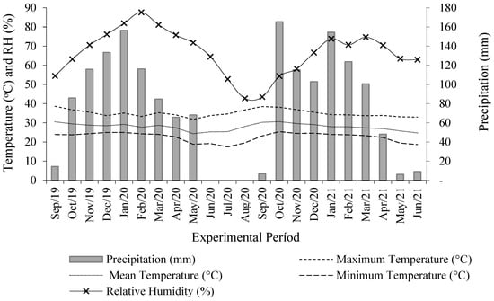 Monthly means of minimum, mean, and maximum temperature (°C); relative humidity (%); and precipitation (mm) during the experimental period of September 2019 through June 2021 in Acorizal, Mato Grosso state, Brazil. Source: Inmet, 2023 [].