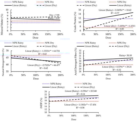 Bromatological characteristics of Marandu grass under the effect of varying doses of mixed gelatin sludge during dry and rainy seasons. R2: Coefficient determination of the regression variance analysis. The * and ** indicate levels of significance of constants within regression models of 5% and 1%, respectively; NPK Rainy and NPK Dry were not considered in the regression model as it is the standard treatment studied (50 kg ha−1 of N). iNDF: indigestible neutral detergent fiber.