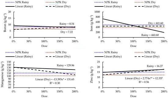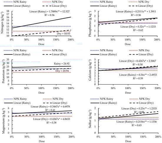 The doses tested showed a positive linear effect on levels of phosphorus (P), with maximum values of 26.51 and 23.25 g kg−1 observed for the highest dose of MGS during the rainy season and dry season, respectively (Figure 6). The calcium levels also showed a positive linear relationship with increasing MGS dose. Maximum levels of 3.29 and 3.31 g kg−1 were found for rainy and dry seasons, respectively. The Mg levels within leaf tissue showed a positive linear relationship with increasing MGS dose with all values observed above the recommended amounts of 1.5 to 4.0 g kg−1 []. The levels of sulfur in leaf tissue showed a positive linear relationship with increasing dose of MGS for both seasons evaluated. Maximum values of 1.54 g kg−1 in the rainy season and 1.63 g kg−1 in the dry season were found for maximum doses of MGS (Figure 6). For micronutrients in all treatments, iron stands out, as it has levels above what is considered adequate at 50 to 250 mg kg−1 []. The micronutrients copper and zinc show significant linear relationships with increasing levels of MGS during the dry season, with maximum values of 5.10 and 18.13 mg kg−1, respectively, for the highest dose tested (Figure 6).