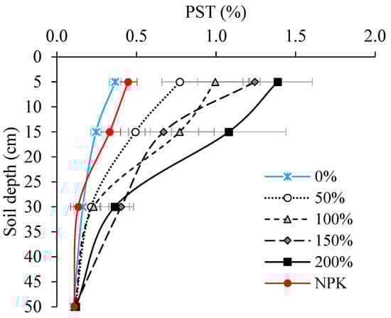 To classify soils that are affected by salts, limiting conditions are based on measurements of soil water at saturation: electrical conductivity, exchangeable sodium percentage, sodium adsorption ratio, and pH (Table 9). The results of exchangeable sodium percentage (ESP) in soil are presented in Figure 7. The highest concentration of Na (18 mg dm−3) and the highest ESP (1.39%) were found for the highest dose of mixed gelatin sludge at the soil surface layer (0–10 cm), which significantly increased the ESP in all the fertilized plots. However, it is important to note that this ESP is well below the limit of 15% considered to indicate sodic soils [,].