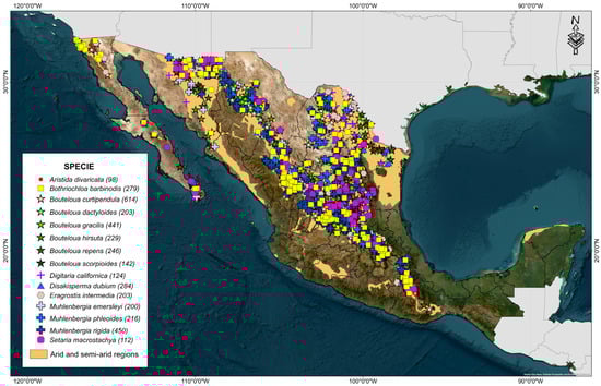 To address this work, a database was compiled with passport data of georeferenced accessions of 15 species of native forages from arid and semi-arid regions of Mexico (Table 1). Passport data were obtained from georeferenced coordinates taken on field trips and a search in the Global Biodiversity Information Facility webpage for each species [,,,,,,,,,,,,,,].