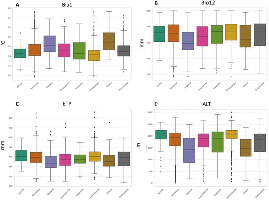 Finally, regarding altitude, it was identified that the analyzed species recorded an average value between 1411 to 2133 m. When considering extreme altitude values, B. repens was the species that was located in the sites with the lowest altitude (7 m), while M. phleoides was located at a maximum altitude of 2999 m. The boxplots in Figure 2 show the distribution and comparison between the nine genera of the 15 species. The selected variables are considered to be the most important for the distribution of any species [,,]. An aspect to highlight in these graphs is the presence of outliers in the variables, especially in the average annual temperature and altitude, mainly in the genera Bouteloua and Muhlenbergia.