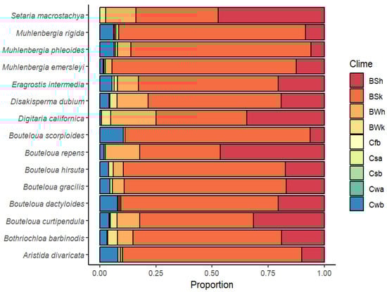 Climatic diversity and climatic type proportion for 15 forage grasses from the arid and semiarid region of Mexico. BSh (arid, steppe, hot), BSk (arid, steppe, cold), BWh (arid, desert, hot), BWk (arid, desert, cold), Cfb (Temperate, no dry season, warm summer), Csa (temperate, dry and hot summer), Csb (temperate, dry and warm summer), Cwa (temperate, dry winter, hot summer), and Cwb (temperate, dry winter, cold summer).