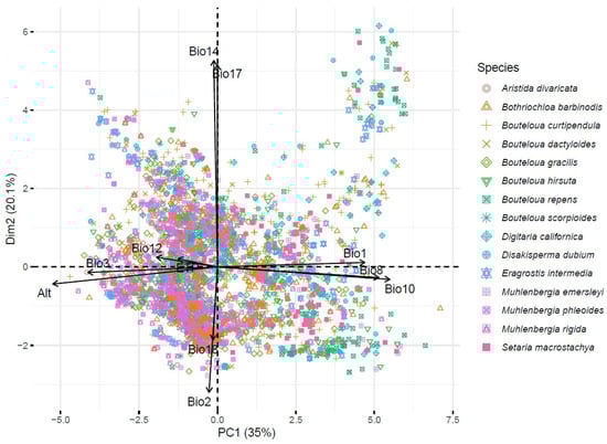Biplot based on 13 climatic variables and 3841 accessions of forage grasses from arid and semiarid regions of Mexico. Bio1 = annual mean temperature (°C), Bio2 = mean diurnal range (°C), Bio3 = isothermality, Bio8 = mean temperature of wettest quarter (°C), Bio10 = mean temperature of warmest quarter (°C), Bio11 = mean temperature of coldest quarter (°C), Bio12 = annual precipitation (mm), Bio14 = precipitation of driest month (mm), Bio17 = precipitation of the driest quarter (mm), Bio18 = precipitation of the warmest quarter (mm), Alt = altitude (m), and ETP = annual evapotranspiration (mm).