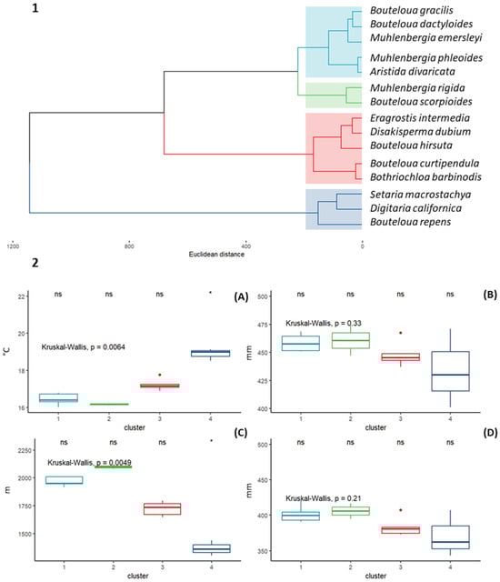 Cluster 4 is Setaria macrostachya, Digitaria californica, and Bouteloua repens. This group formed by three species is the most contrasting with the clusters previously described. The average altitude is 1436 m (the lowest recorded for all species). Regarding the average annual temperature of the group, the highest recorded among all species, an average value of 18.4 °C was recorded. Finally, for the variables that describe water availability among these species, the highest average precipitation and evapotranspiration values were reported (432 and 363 mm, respectively).