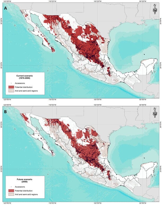 According to Arredondo (2005) [], the semiarid grasslands of Mexico are distributed in a strip from the north to the southeast of the country, from Sonora to Guanajuato, while the arid shrublands extend widely from Baja California to Oaxaca. According to the results obtained, the current potential distribution generally agrees with what is reported in the literature, although it can be observed (Figure 6A) that not all areas considered arid or semi-arid [] are suitable sites for the presence and establishment of the forage species analyzed.