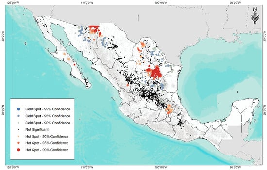 A hotspot analysis (Figure 7) identified two sites of high abundance (99% confidence), one in the north of the country in the border region between Sonora and Chihuahua and another in the south of the border zone of Coahuila and Nuevo León. Regarding cold or low diversity points (99% confidence), four areas were identified: north of Sonora, the central area of Chihuahua, north of Coahuila and Nuevo León, and the southern area of Tamaulipas bordering San Luis Potosí.