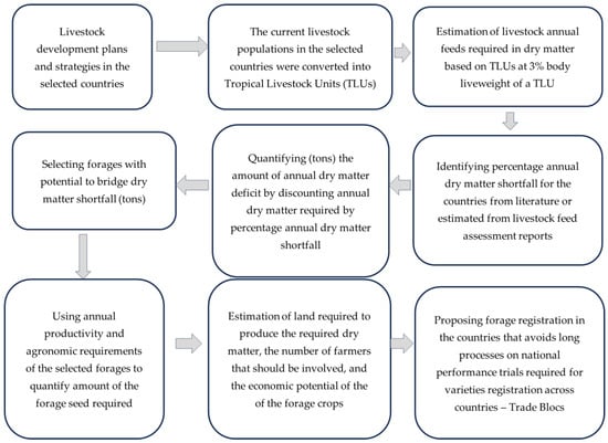 We begin by examining the governmental priorities for the livestock sector in the studied countries to identify future goals and needs. Next, we calculate the annual feed demand for ruminant livestock and the existing feed deficit. Following this, we select two forage grasses—Urochloa hybrids and Megathyrsus maximus—and two forage legumes—Lablab purpureus and Vigna unguiculata (cowpea)—chosen for their adaptability to the predominantly tropical agroclimatic conditions of these countries, their provision of essential nutrients for ruminants, and the availability of their seeds. Urochloa and Megathyrsus genera have undergone significant forage improvement through selection and breeding, an area where progress has lagged in Africa compared to food crops. International private companies have taken up seed multiplication, making seeds available globally [,]. Lablab purpureus and Vigna unguiculata, which are well adapted to relatively dry regions, have also benefited from substantial improvement efforts by international researchers and are widely recognized and utilized by farmers in Africa [,]. We then calculate the quantity of forage seeds needed to bridge the estimated feed deficit. Afterward, we estimate the land area required to cultivate these forages, the number of farmers needed for adoption, the economic value of this potential forage seed market, and the value that forage crop adoption could generate over a 10-year period. Finally, we outline the steps necessary to develop a functional forage seed system to support widespread adoption.