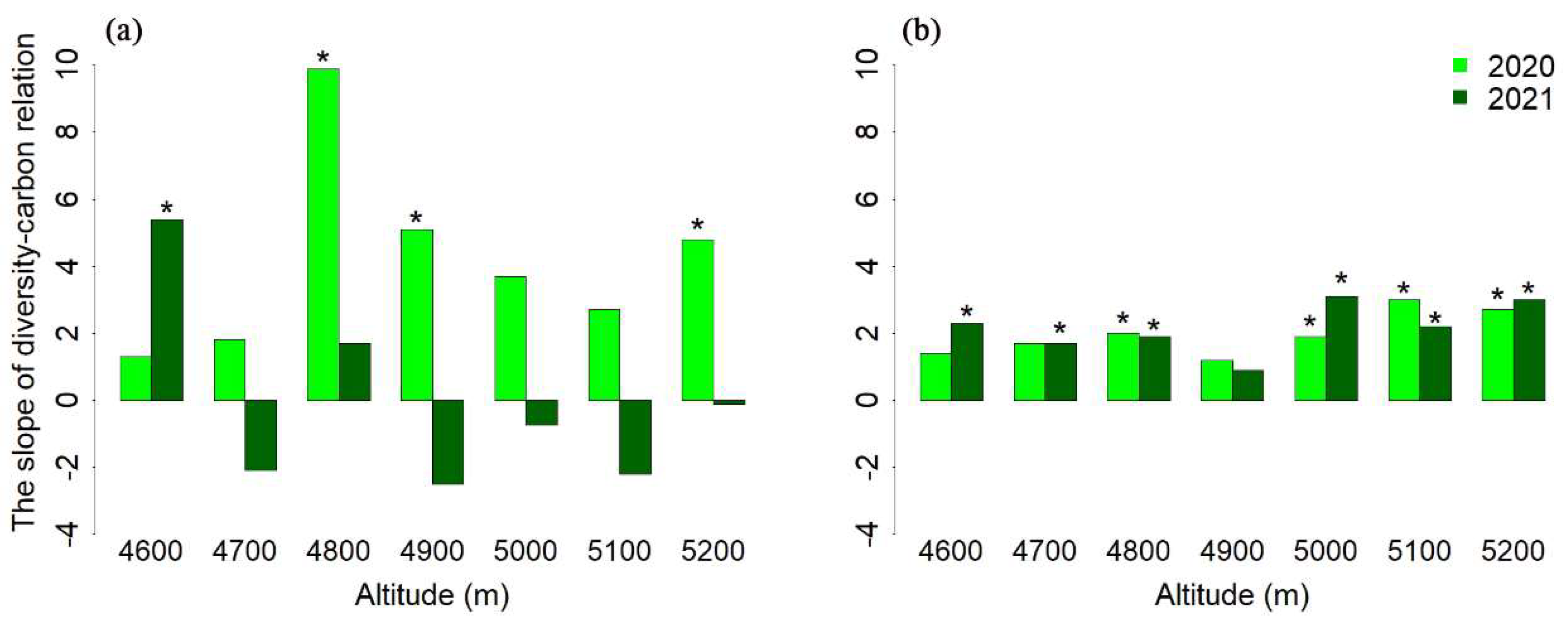 3.2. The Differences in the Diversity–Carbon Relationship over a Two-Year Period