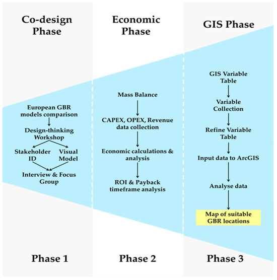 This study was divided into three interlinked phases: the co-design phase as phase 1, the economic analysis as phase 2 and the GIS analysis as phase 3, as shown in Figure 1. The co-design phase was used to first identify key stakeholders and design a local green biorefinery model with input from these stakeholders. Findings from this phase were then used to inform the economic analysis of the selected biorefinery model. Finally, the results of both the co-design and economic phase were used to inform the GIS phase to identify the most suitable locations at a local scale for local green biorefinery deployment under specific conditions.