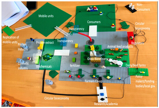 From the initial co-design and Lego® SERIOUS PLAY® activities with experts (Figure 2), eight main stakeholders were identified as having both a direct and indirect impact on a green biorefinery model. It was determined that farmers, agricultural cooperatives, academia and research and market partners would be directly impacted by the model. The remaining stakeholders, the policy makers/regulators, consumers, funding bodies and the local community, would have an indirect impact on the model. Due to green biorefineries focusing on utilising fresh grass or silage, livestock farmers that use grasslands for grazing and silage, primarily beef and dairy production, were considered as the main group of farmers that would be impacted by the biorefinery model, with tillage farmers, who produce green crop residues, also being impacted.