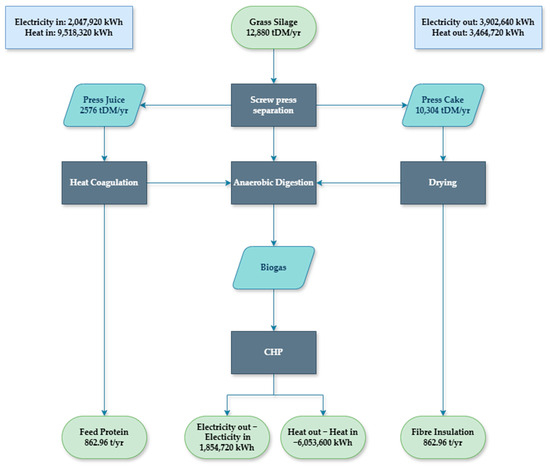 Operating at full capacity, the mass balance of the selected biorefinery model resulted in an annual throughput of 12,880 tDM of grass silage, with 10,304 tDM separated into the fibre press cake, and with 2576 tDM separated into the press juice [49]. A further drying step along with the input or additives is used to convert the press cake to fibre insulation material, which resulted in an output of 5796 tDM of grass insulation product. The press juice is processed using a heat coagulation and a drying step to separate the proteins, resulting in an output of 863 tDM animal feed protein. The mass flow is presented in Figure 3 below. Converting the residual stream to biogas and heat and electricity via CHP generates sufficient electricity to meet the process needs but results in a heat deficit for the process.