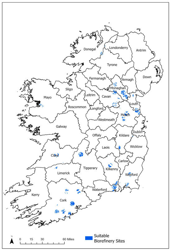 Map of the suitable locations in Ireland for green biorefinery deployment.