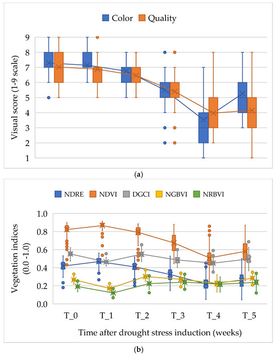 The mean separation for visual assessment and spectral reflectance (LSD0.05) for all the genotypes showed that there were significant differences between the weeks (Figure 2). Average color and quality scores were significantly affected starting at week three (T_2) (Figure S1a). After rewatering, color recovered faster than quality. The spectral vegetation indices showed the same trend (Figure S1b), and the total fraction of green (NDVI) decreased faster than the DGCI.