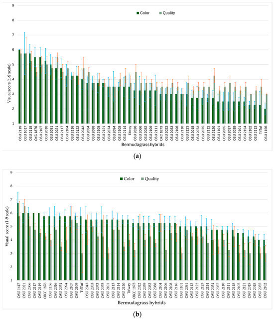Mean (±SE) color and quality scores of bermudagrass hybrids (a) four weeks post-drought stress initiation and (b) one week after rewatering in a controlled environment.