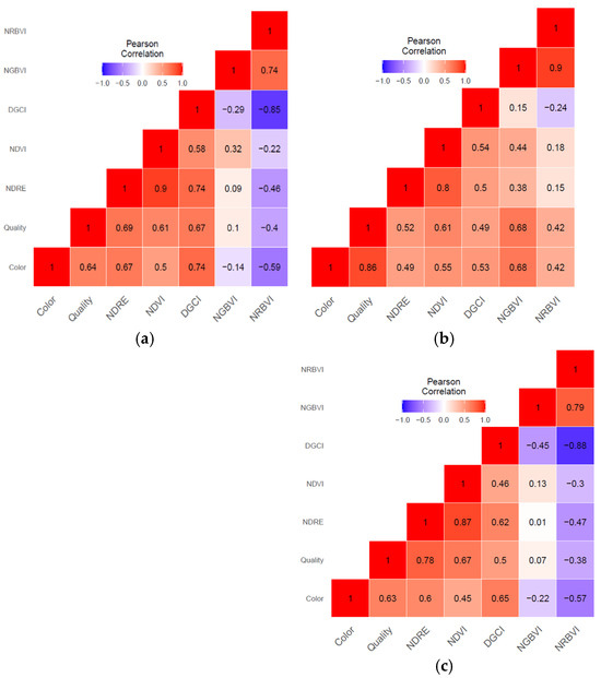 In the recovery phase, strong positive associations were observed for color with quality (r = 0.63, p ≤ 0.001), NDRE (r = 0.60, p ≤ 0.001), and DGCI (r = 0.65, p ≤ 0.001). Similarly, quality had a strong positive association with NDVI (r = 0.67, p ≤ 0.001), NDRE (r = 0.78, p ≤ 0.001), and DGCI (r = 0.50, p ≤ 0.001). Furthermore, NDRE showed strong positive correlations with NDVI (r = 0.87, p ≤ 0.001) and DGCI (r = 0.62, p ≤ 0.001). Other pairwise comparisons including NGBVI with NRBVI (r = 0.79, p ≤ 0.001) showed strong positive relationships. NDVI showed a moderate positive correlation with color (r = 0.45, p < 0.001) and DGCI (r = 0.46, p ≤ 0.001). In contrast, NRBVI had significant negative associations with DGCI (r = 0.88, p ≤ 0.001) and color (r = −0.57, p ≤ 0.001). Negative associations of NRBVI with quality (r = 0.38, p ≤ 0.001), NDRE (r = 0.47, p ≤ 0.001), and NDVI (r = 0.3, p ≤ 0.001) were also observed. A statistically significant negative association was also observed between NGBVI and DGCI (r = 0.45, p ≤ 0.001). Despite the significant positive or negative correlations presented above, no associations were detected (p ≤ 0.05) for NGBVI with quality (r = 0.07), NDVI (r = 0.13), and NDRE (r = 0.01).