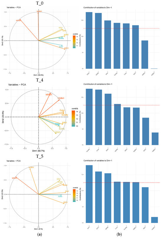 Principal component analysis, (a) relative contribution of the visual and spectral scores, and (b) the first principal component and its contributors at T_0, T_4, and T_5.