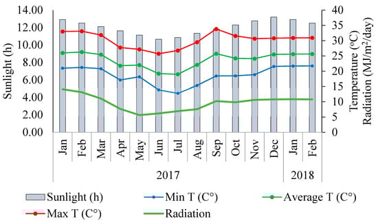 Average (average T), maximum (Max T), and minimum (Min T) air temperature, sunlight (h), and radiation verified during the experimental period.