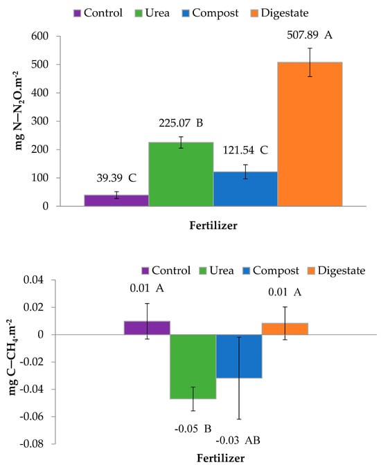 Cumulative N2O and CH4 emissions from soil cultivated with Piatã grass and fertilized with control, urea, compost, and digestate. Means with different uppercase letters differ by Tukey’s test (p < 0.05).