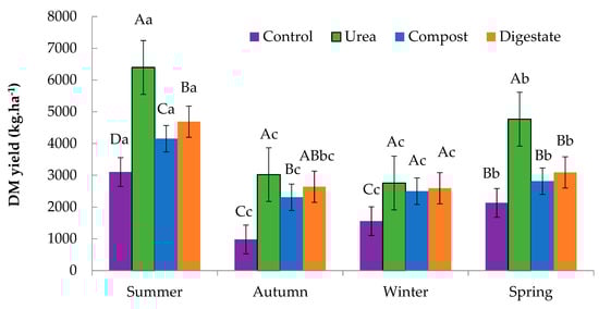 An interaction (p < 0.05) was found between the seasons and type of fertilization on the dry matter production (DMP). The highest DMP was observed for the treatment fertilized with urea during the summer, followed by the digestate, compost, and control treatments in the same season. Summer was the most productive season; followed by spring in second; and autumn and winter, which did not differ from each other, in third place for DMP. The only exception was observed for the digestate treatment, in which the DMP did not differ (p > 0.05) between spring and autumn (Figure 4).