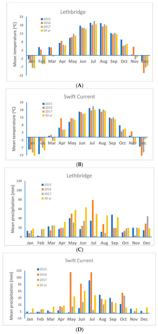 Mean monthly temperature (A,B) and total monthly precipitation (C,D) for 2015–2017 and long-term (30 years) average for Lethbridge, AB, and Swift Current, SK, Canada.