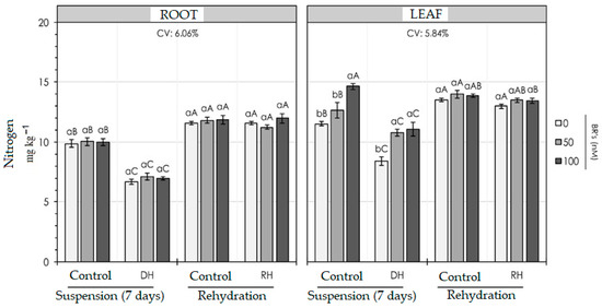 In the leaves under water stress conditions, the nitrogen content of the plants was reduced by 30% compared to the control. The plants that received 24-epibrassinolide (50 and 100 nM) did not differ statistically, but there was a difference compared to those that did not receive 24-epibrassinolide. The water conditions showed significant differences. In the control plants, in the leaves, at a dosage of 100 nM, a greater amount of nitrogen was observed by approximately 20% compared to those without BR; however, in the stressed plants, the dosage of 50 nM obtained better efficiency, with an increase of approximately 38% when compared to the control plants. The rehydrated plants had the same amounts of N compared to the control plants, regardless of the applied concentration of BR (Figure 1).
