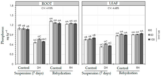 When BR was applied to plants with a water deficit, the 50 nM dosage was more efficient, since when applied, it increased P levels by 20% when compared to plants without BR in the same treatment. For rehydration, there was no statistical difference between BR dosages within and between the control and rehydration treatments. Brassinosteroid hormones have been shown to have a beneficial effect on plant organs, boosting the processes they develop, such as root growth, their association with mycorrhizal fungi, and photosynthesis, which are processes that are closely linked to P [17].