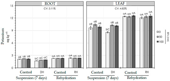 In the roots, the potassium concentration was the same in both control and water-deficit plants, regardless of the applied BR concentrations. Figure 3 shows the influence of 24-epibrassinolide (0, 50, and 100 nM) on the potassium contents (leaf and root) of sorghum seedlings.