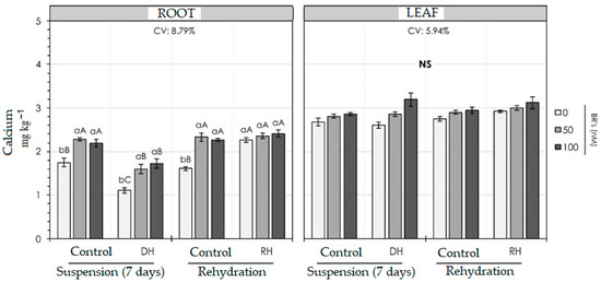 In the root part, during the period of irrigation suspension, there was a 45% decrease in calcium content when compared to the control. For the application of BR, the dosage of 50 nM was more efficient, as it increased Ca levels by 35% and 45% for control and water deficit plants, respectively. During the rehydration period, the calcium levels of sorghum plants returned to the same amounts as the control, regardless of the BR dose used (Figure 4).