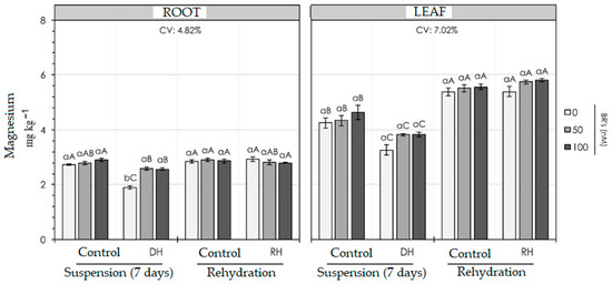 In the study conducted by Fonseca and Meurer [28], an experiment with corn in a nutrient solution was carried out to investigate the antagonistic relationship between potassium and magnesium. The researchers observed that magnesium accumulation was reduced in both the roots and aerial parts of the plants when there was an increase in potassium in the solution. The authors suggested that this antagonism is related to the process of absorption of these two nutrients via the plant roots. In BR applications, at 50 nM, magnesium levels increased by 30% in plants without BR in the same treatment. For rehydration, the amounts of Mg were the same as in the control plants, regardless of the 24-epibrassinolide concentration.