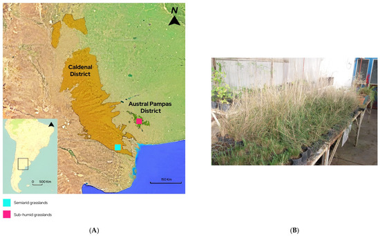 (A) Study sites with the location of the sub-humid and semiarid grasslands in the Austral Pampas District and Caldenal District, respectively. (B) Plants of Nasella tenuis from sub-humid and semiarid grasslands with contrasting grazing histories, cultivated under greenhouse conditions.