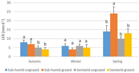 Average leaf elongation rate (mm d−1) (LER) of Nassella tenuis plants from grasslands with different water regimes and grazing histories, measured in autumn, winter, and spring. Within each season, columns with the same letter do not differ significantly (p < 0.05).