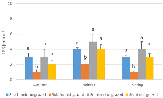 Average leaf senescence rate (mm d−1) (LSR) of Nassella tenuis plants from grasslands with different water regimes and grazing histories, measured in autumn, winter, and spring. Within each season, columns with the same letter do not differ significantly (p < 0.05).