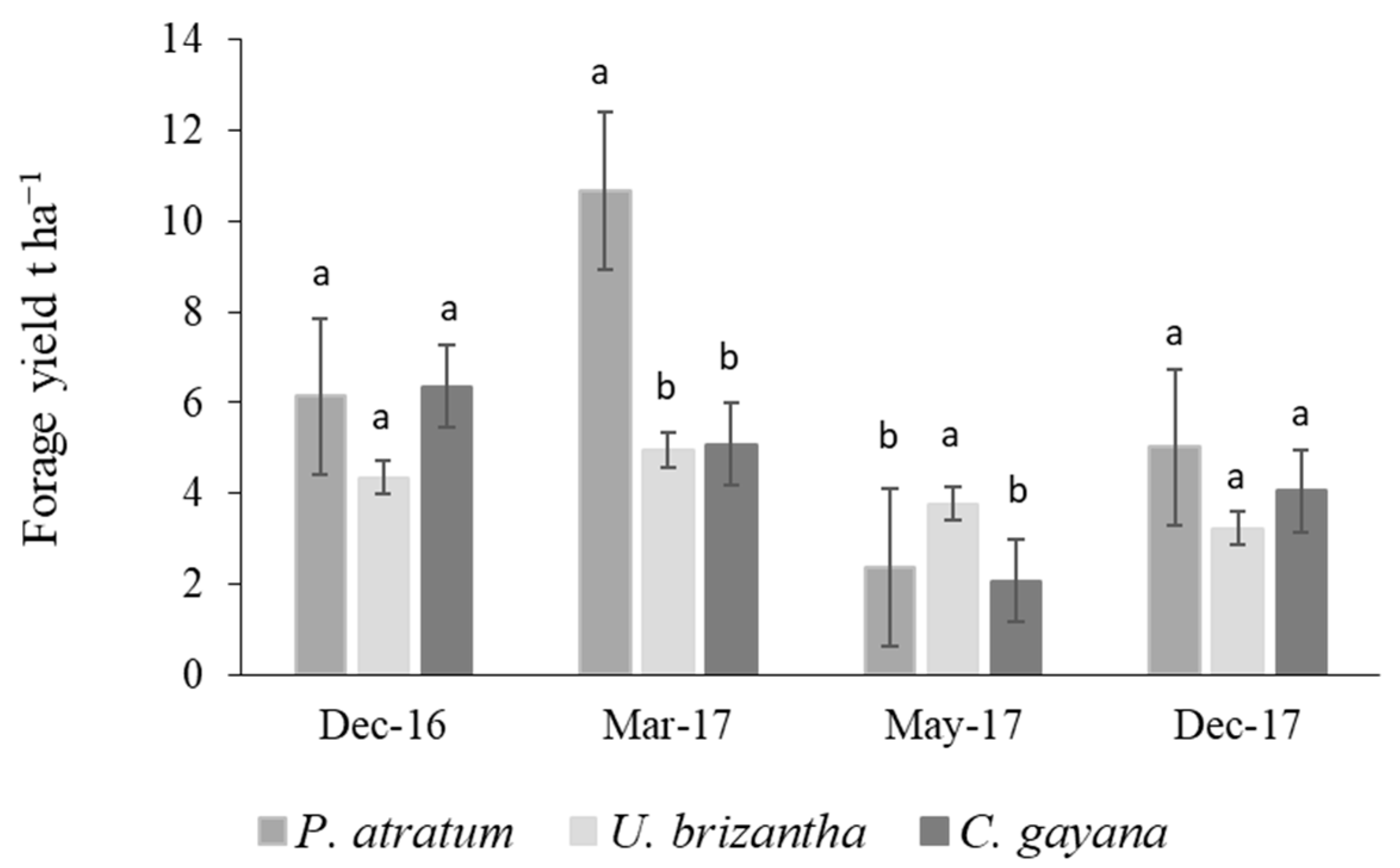 - Sollenberger, L.E.; Vendramini, J.M.B.; Pedreira, C.G.S.; Rios, E.F. Warm-season grasses for humid areas. In Forages: The Science of Grassland Agriculture, 7th ed.; Moore, K.J.M., Collins, C.J., Redfearn, D.D., Eds.; Wiley: Hoboken, NJ, USA, 2020; Volume 2, pp. 331–346. [Google Scholar]