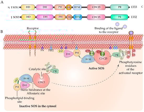 Son of Sevenless: Mammalian SOS consists of the ubiquitously expressed homologs SOS1 and SOS2, which share 70% sequence similarity. SOS1 is composed of six domains, namely, the N-terminus histone-domain (HD), followed by the Dbl homology domain (DH), the Pleckstrin homology (PH) domain, the Ras exchange motif (REM), the Cell division cycle 25 (CDC25) homology domain, and the proline-rich (PR) domain. In quiescent cells, C-terminal proline-rich (PXXP) remains bound to Src Homology 3 (SH3) domain of the adaptor protein Growth factor receptor bound 2 (Grb2). DH and PH autoinhibit SOS activation by inducing steric hindrance at the allosteric site. HD further stabilizes this autoinhibited state by docking to a helical linker between PH and REM domains [5]. On receptor stimulation, the SOS1—Grb2 complex is recruited to the PM, where it binds to the phosphotyrosine residues of the activated receptor. The catalytic core, also known as SOScat, is the center portion of SOS1 and contains the REM and CDC25 domains. SOS is activated on the binding of Ras-GTP to an allosteric site located between REM and CDC25, which opens the active sites of SOS, and further stimulation from CDC25 leads to nucleotide exchange. Thus, Ras acts as an allosteric modulator of SOS activation by inducing positive feedback [6]. PH and HD domains also engage in interactions with membrane lipids, such as phosphatidylinositol-4,5-bisphosphate (PIP2), to further release this inhibition [7] (Figure 1). There are multiple phosphorylation sites on SOS, and a study identified five MAP kinase sites—Ser1137, Ser1167, Ser1178, Ser1193, and Ser1197—on human SOS1 (hSOS) and only one phosphorylation site on hSOS2 that regulate Grb2-SOS association [8]. Ras activation by SOS predominantly activates signaling from the PM; however, the phospholipase D2-controlled localization of Grb2—SOS—Ras to the GC also suggests its role in activating Golgi-Ras [9]. SOS1 could also stimulate nucleotide exchange in the ER pool of H-Ras [10].