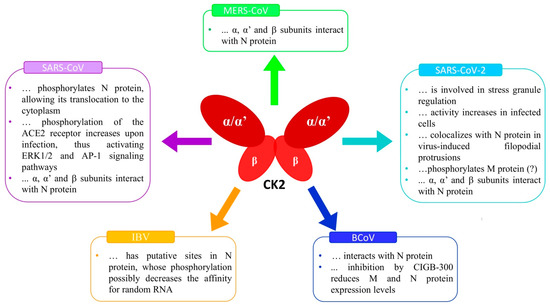 SARS-CoV-2, like the other β-CoVs, exploits the ACE receptor, a CK2 substrate [45], raising the interest in CK2 as an anti-COVID-19 target. But regardless of ACE, as early as the first year of the COVID-19 pandemic, two important papers were published that directly correlated CK2 to SARS-CoV-2 infection. Gordon et al. [58] applied an affinity-purification/mass spectrometry approach to identify host proteins exploited by the virus and already targeted by existing drugs. Among the human druggable proteins that physically associate with SARS-CoV-2 proteins, they identified CK2, which was supposed to be involved in stress granule regulation. Consistently, CK2 inhibitors disrupt stress granules. All the CK2 subunits (the α (CSNK2A1) and α’ (CSNK2A2) catalytic isoforms and the β regulatory subunit (CSNK2B)) were found to bind to the N protein [56].