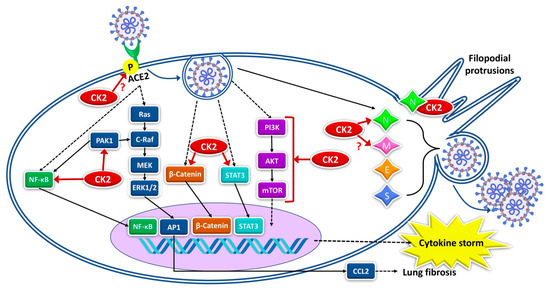 SARS-CoV-2 activates several host cell kinases [36], with the final effect of complex crosstalk between different signaling pathways globally contributing to virus infection and replication. An example of great relevance for this review is the case of the PI3K/Akt pathway: it is deeply interconnected with CK2, which potentiates it by acting at several levels [62]. Since this pathway is instrumental to SARS-CoV-2 biology [63,64], CK2 also contributes to virus replication by boosting it. Another example of the intricate network by which CK2 might sustain the SARS-CoV-2 infection is the ERK1/2 and AP-1 signaling pathway (previously mentioned also for SARS-CoV), in which PAK1, an activator of this pathway and a substrate of CK2, can promote the activation of the transcription nuclear factor-κB (NF-κB) and STAT3 pathways [65]. Both NF-κB and STAT3 are CK2 substrates, involved in the induction of inflammatory cytokine expressions and polarization of M2 macrophages promoting lung fibrosis in response to SARS-CoV-2 infection, respectively [66,67]. An additional crossing point between CK2 and SARS-CoV-2 is the Wnt/β-catenin signaling pathway, which CK2 regulates [68,69] and is crucial in SARS-CoV-2 infection since the treatment of SARS-Cov-2 infected cells with iCRT14t, a specific inhibitor of Wnt/β-catenin, decreased the cytopathic effect (changes in cell morphology caused by the virus) and reduced SARS-CoV-2 N protein level [36].