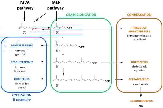 - Hemmerlin, A.; Harwood, J.L.; Bach, T.J. A raison d’être for two distinct pathways in the early steps of plant isoprenoid biosynthesis? Prog. Lipid Res. 2012, 51, 95–148. [Google Scholar] [CrossRef] [PubMed]
