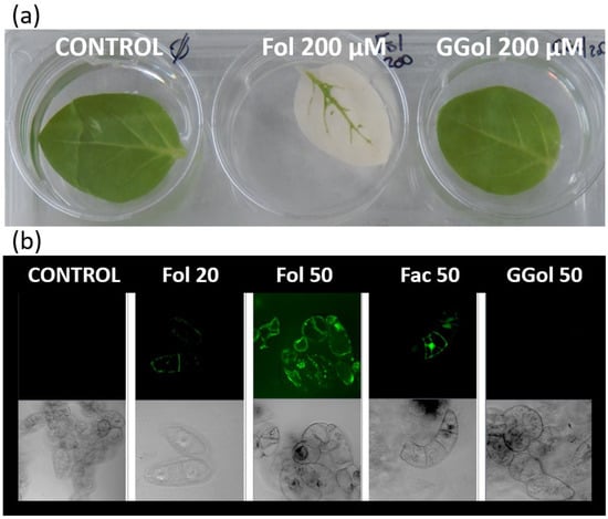 Farnesol, an inducer of oxidative stress in plants. (a) Tobacco leaf assay. Tobacco leaves from one-month-old plantlets were placed for 3 days in a KH2PO4 (100 µM, pH 7.5) solution containing no additive (CONTROL), containing farnesol (200 µM) (Fol) or geranylgeraniol (200 µM) (GGol). (b) One-week-old stationary tobacco BY-2 cells were diluted (1:5) in fresh Murashige and Skoog medium [50] and treated for 48 h with farnesol (Fol), farnesol acetate (Fac) which cannot be metabolized or geranylgeraniol (GGol). The final concentrations were adjusted to either 20 µM or 50 µM. The green fluorescence observed in the upper series of images corresponds to fluorescein emission. The lower series corresponds to DIC (Differential Interference Contrast) images.