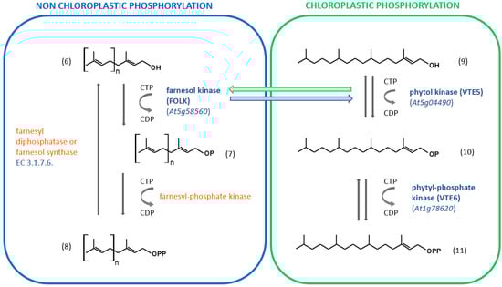 The phosphorylation/dephosphorylation procedures for the synthesis of isoprenols and their reactivation into isoprenyl diphosphates have recently been reviewed [28]; it is encouraged to refer to this comprehensive review for more details. Here, we will focus on the phosphorylation process required to recycle farnesol into farnesyl diphosphate and phytol into phytyl diphosphate. We will see that isoprenols, as intermediates, will be reactivated by a two-step phosphorylation process to isoprenyl diphosphates, which can then reintegrate the isoprenoid biosynthetic pathway.