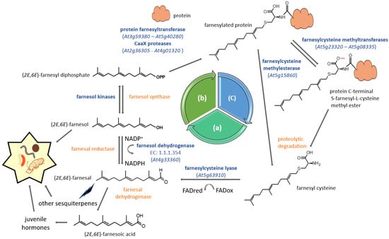 FPP salvage pathway for protein prenylation. The cyclic pathway undergoes three steps including (a) the degradation of prenylated (farnesylated) proteins and the recovery of farnesol, (b) a phosphorylation process leading to the reactivation into farnesyl diphosphate and finally (c) the prenylation and maturation of the protein. Enzyme reactions catalyzed by farnesol kinases have been described in Figure 3. Characterized genes and proteins are indicated in blue, as is the corresponding AGI locus code. When the gene is unidentified, the enzyme is indicated in orange.