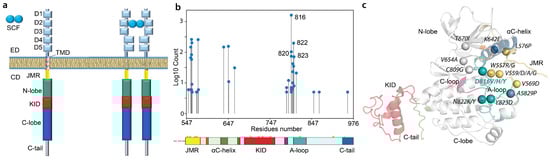 KIT’s physiological functions are highly related to its molecular features—modular architecture, plasticity, and transmembrane location—providing tight cooperation of KIT’s extracellular and cytoplasmic domains (ED and CD) through a single-pass helical linker, the transmembrane domain (TMD) (Figure 1a).