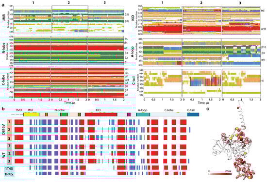 KITD816V folding. (a) The time-dependent evolution of the secondary structures of KITD816V per domain/region, as assigned by the Define Secondary Structure of Proteins (DSSP) method: α-helices in red, 310-helices in blue, parallel β strands in green, antiparallel β strands in dark blue, turns in orange, and bends in dark yellow. The three MD replicas (1–3) were analysed individually. (b) The secondary structures—αH-(red), 310-helices (light blue), and β-strands (dark blue)—assigned for a mean conformation of each MD trajectory (1–3) of KITD816V and KITWT, and for the crystallographic structures of inactive (PDP ID: 1T45) and active (PDB ID: 1PKG) KITWT. (c) The increase in helical folding of KITD816V compared to KITWT was estimated by the difference in probability of folding per couple of residues i from KITWT and KITD816V and illustrated by the thickness of the coloured ribbons (large ones are red, small ones are white).