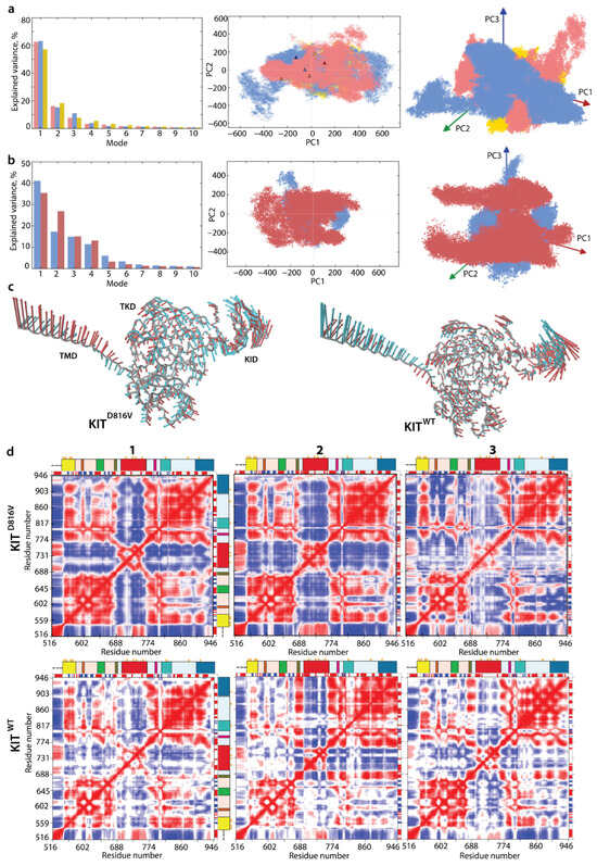 Before conducting a comparative analysis between KITD816V and KITWT, it is worth noting that the three first modes describe about 85–90% of all collective motions observed in each of the three KITD816V MD trajectories (Figure 3a).