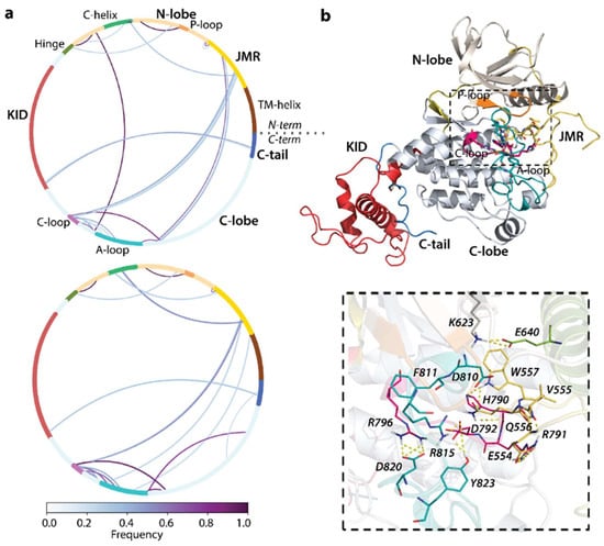 Receptor KITD816V is constitutively active, and its aberrant activity has been explained by structural transformations in the JMR and A-loop, which lead to a disruption of the coupling between these regions, and manifested as a disturbance of their communication pathways [,].