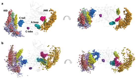 This cluster analysis of the KITD816V individual ID regions demonstrates that the degree of the intrinsic structural and conformational disorder is greater compared to KITWT [], highlighting the mutation-induced effects on each functional KIT fragment—JMR, A-loop, KID, and C-tail. The comparative analyses of ID regions in KITD816V and KITWT indicate that KID is the most disordered domain and the most influenced by the D816V mutation.