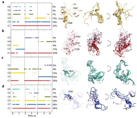 The majority of JMR conformations are encompassed within the three most populated clusters, C1 (52%), C2 (19%), and C3 (12%), comprising conformations observed in each MD trajectory (Figure 6). All JMR conformations exhibit transient secondary structures, a short β-sheet, and a transient 310-helix in the JM-S and JM-Z segments, which undergo reversible folding/unfolding events. The representative conformations of these clusters differ only in the position of the JM-P segment containing Y547, previously identified in vitro as a phosphotyrosine []. This alternate conformational dispersion of JM-P leads to a large area of Y547 location, while the other tyrosines are nearly superimposed (Figure 5).