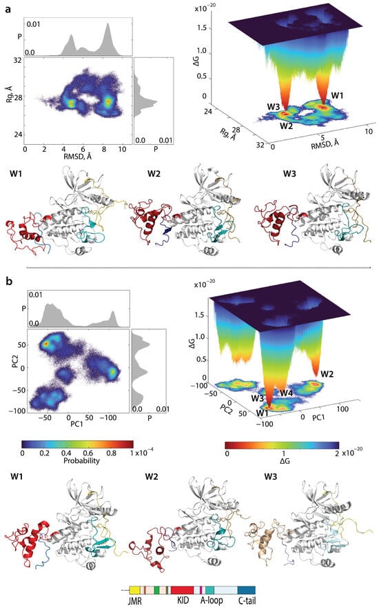 Free energy landscape (FEL) of KITD816V as a function of the reaction coordinates, (a) Rg (in Å) versus RMSD (in Å) and (b) two PC components (PC1 versus PC2) were generated using the MD conformations of KITD816V for the conformational ensemble sampled from the merged replicas and fitted on the initial conformation. (top panel) The 2-dimensional representation of the FEL of the KITD816V conformational ensembles (left). Probability distribution of each reaction coordinate is shown at the top and right, respectively. The 3-dimensional representation of the relative Gibbs free energy (right). The red colour represents high occurrence, yellow and green low, and blue represents the lowest occurrence. (bottom panel (a,b)) KIT conformations from wells 1–3.