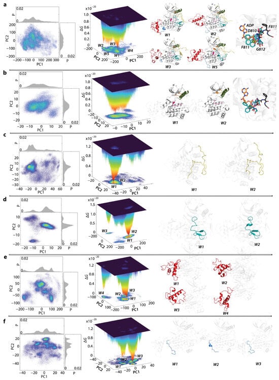 Free energy cumulative landscape (FECL) of two KIT proteins as a function of the reaction coordinates, taken as two PCA components (PC1 vs PC2). FECLs were generated on the concatenated trajectories consisting of MD conformations of KITWT and KITD816V mutant, normalised to the initial conformation of KITWT (t = 0 µs). (a–f) The 2D representation of FECL of the KIT conformational ensembles focusing the full-length cytoplasmic domain (a); the full-length cytoplasmic domain without A-loop (b); the JMR (c); the A-loop (d); the KID (e); and C-tail (f) (left column). The 3D representation of the relative Gibbs free energy (middle column). The red colour represents the highest occurrences, yellow and green represent low, and blue represents the lowest occurrences. The wells (W) are numbered from deepest (W1) to shallower (W2, W3,...). Each identified well contains at least 1% of the total conformations, and ΔG ≤ 0.45 × 10−20 KbT. The major representation conformation (in cartoon) from the most populated minima (right column) is highlighted by colour: white (TKD or not relevant domain), yellow (JMR), orange (P-loop), green (αC helix), red (KID), pink (C-loop), A-loop (teal), C-tail (blue).
